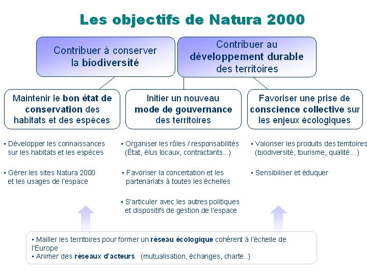Le principal enjeu du réseau Natura 2000 est de maintenir, dans un état de conservation favorable à la biodiversité, les habitats naturels et les espèces d'intérêt européen tout en tenant compte des exigences sociales, économiques et culturelles des territoires.